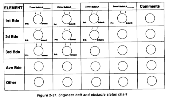 The CP displays information with charts and operations maps. Task organization or mission charts reduce need for discussion. Charts also use color codes to depict current status. Color codes rapidly present a clear status of items using color criteria established in the SOP. This allows the commander to quickly assess critical elements and focus the staff efforts to "fix" or "continue to fix" the problem. If he desires further information, the CP staff can retrieve or pull it from the submitting staff section or MSC in the tree mode. Only information that directly contributes to a commander's critical decision is retrieved. This allows the staff time to continue routinely coordinating, integrating, and synchronizing current and future operations. The amount of time available and the experience of staff will be the driving factors.