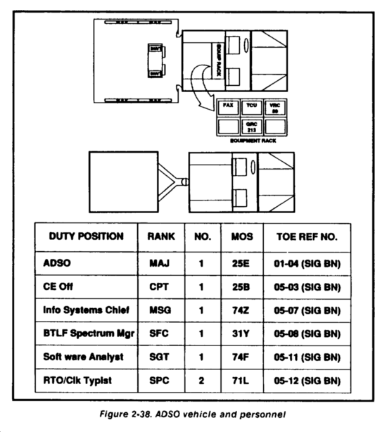 The division's signal battalion provides a small ADSO element to the rear CP to support rear operations and signal support. Its functions for the rear CP are the same as those for the main CP. The ADSO element at the rear CP works for the senior G3 officer in the operations cell. The ADSO element functions from a HMMWV and SICPS tent (Figure 2-55).