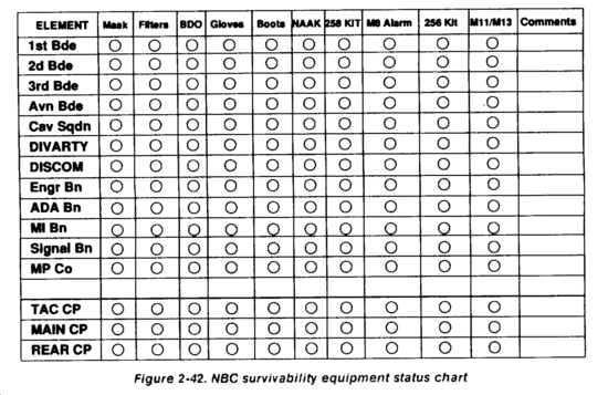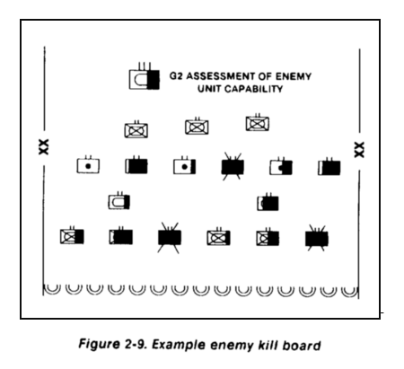 The rear CP G2 maintains gumball and killboard charts similar to those used in the TAC and main CPs. The gumball chart depicts units that directly support the intelligence effort in the rear. The killboard charts reflect known enemy units operating in the rear area.