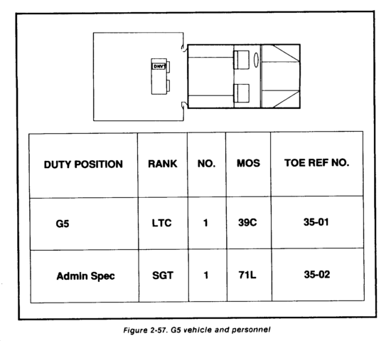 The G5 normally requires augmentation from division assets until the arrival of reserve civil affairs element. A technique for augmenting the G5 element is to use a portion of the staff judge advocate (SJA) element to support the G5 operations. (The skills of the SJA personnel can easily support the missions and functions of the G5.) With the arrival of division and or reserve civil affairs (CA) units, the G5 element becomes the core and supervisor of the division civil-military operations center (CMOC). Figure 2-57 shows G5 vehicle and personnel.