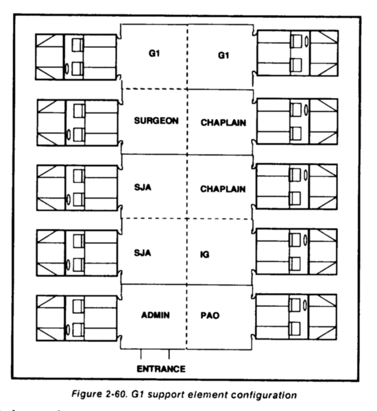 The G1 support element, located near the rear CP, coordinates and executes the personnel element functions. This element comprises the major sections of the G1 and special staff (such as inspector general (IG), public affairs officer (PAO), chaplain, surgeon, and SJA). Elements from a corps personnel service company normally augment the personnel section. Personnel functions are physically executed from within several SICPS tents. This includes strength management, casualty reporting, replacement operations, health service support (HSS), chaplain services, and legal services. It also includes morale support activities, postal services, and public affairs (PA). Finance support is provided by the corps finance unit assigned to the division area.