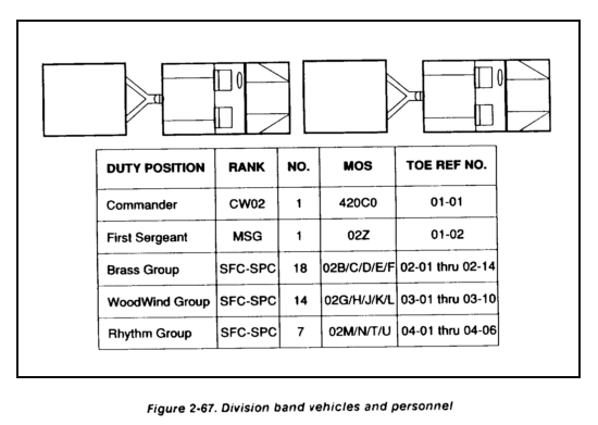 The band may perform other secondary missions, working under the supervision of the appropriate staff leader. The duration and activity of the secondary mission, however, must be considered. The band must be able to quickly resume its primary mission when called on. If at all possible, unit integrity should be maintained when assigning the band a secondary mission. Figure 2-67 shows the organic vehicles and personnel of the division band.