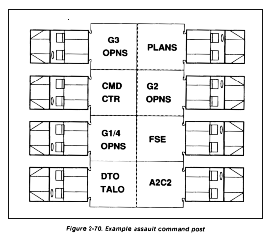 The division TAC CP is often used as the base from which to build the assault CP. It is used with the intent of peeling off functions as the main and rear CPs are established and eventually reverting back to the original TAC CP with its traditional functions. A concept of a base case assault CP is presented at Figure 2-70. This assault CP deploys with nine HMMWVs, eight SICPS shelters, and sufficient personnel to perform critical C2 functions. The HMMWVs contain all communications and computer equipment hard mounted into the rear. This equipment can be used either in the HMMWV, remoted to the SICP shelter, or in a combination of both. A description of the roles and functions of each area follows along with personnel and equipment layouts.