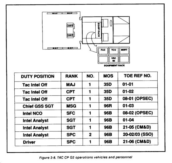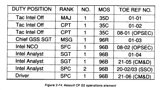 The G2 operations element in the assault CP performs those functions primarily associated with the TAC CP G2 operations section. The assault CP G2 operations is primarily manned by the personnel of the TAC CP and augmented as required. They receive, post, and analyze intelligence data and reports received from committed units and provide them to the command center and higher headquarters. They also receive intelligence information from higher intelligence assets and pass it down to major subordinate units' S2s for their use. They maintain that information from intelligence assets required to support the CCIR to see current and future enemy capabilities and COAs and assess friendly intelligence asset capabilities. Figure 2-74 shows the G2 operations element's required equipment and personnel.
