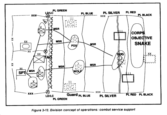 Brigades can sustain field operations for 48 to 72 hours without resupply. The division commander has determined resupply of class I, IV, and V, and evacuation of wounded, will be required on consolidation on objectives (Figure 3-12). The main effort is weighted with CSS assets, particularly HSS. Maximum use of the container delivery system (CDS) is coordinated by G4 to conduct resupply. Preconfigured class VIII packages, tailored to meet specific mission requirements, are shipped via push-packages to HSS elements.