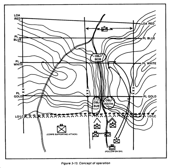 Each operation is described as part of a corps operation. The infantry division operation supports the corps commander's intent and concept of operations.
