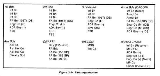 The corps main effort is to pursue enemy forces rapidly with an armored division while the infantry division conducts follow and support operations. The infantry division commander has developed his concept of the operation within the offensive battlefield framework. To accomplish the follow and support mission, the commander task organizes the division as shown in Figure 3-34.