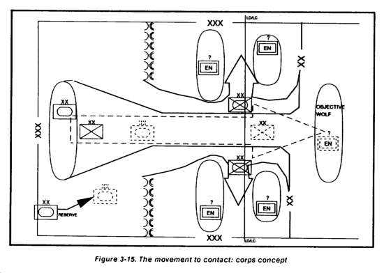 In this example, the corps has been successful in driving back enemy forces from their initial lines of defense. Contact with the enemy has been lost as the enemy has withdrawn. (Figure 3-15). The nature of the terrain causes the corps commander to use his infantry division in a movement to contact to reestablish contact with the enemy. If successful, the corps commander will commit his armored force. The corps commander's intent is to regain contact with the enemy and exploit success. The current tactical situation and intelligence reports indicate: