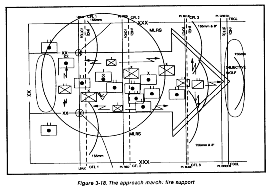 Fire support for the reconnaissance in force consists of the organic artillery of the division, a FA brigade (OPCON), and the defending division's artillery. The DIVARTY positions GS and GSR artillery after clearing positions through the division FSE. Corps priority of fires is to the infantry division until the corps attack begins. Artillery is positioned on the friendly side of the forward line of own troops (FLOT) and does not initially move with the infantry division. At no time is the reconnaissance in force out of the range of FA coverage. All available artillery is positioned to provide fires in depth for the reconnaissance in force elements (Figure 3-26).