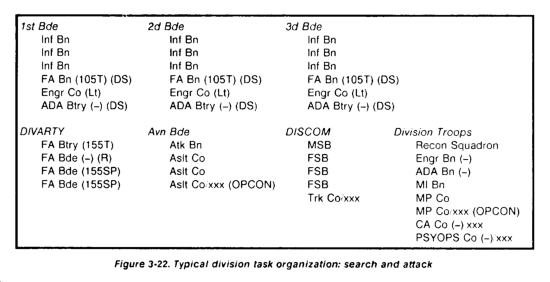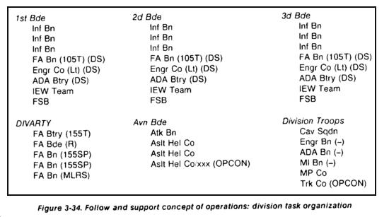 Brigade commanders determine the appropriate force required for each mission. The division provides assets to accomplish follow and support requirements as needed or requested. The TAC CP commits attack helicopter elements and TACAIR as required to support each committed brigade.