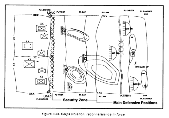 The MI battalion keeps the majority of the division intelligence assets in the division rear area near the LD. These are used as corps assets to collect information and jam enemy C2 nodes as they are located. The corps uses the infantry division's intelligence assets to support its attack until linkup.