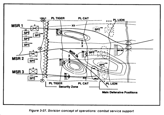 Division CSS (Figure 3-40) must be mobile and continuous during the movement. In this example, the lead division identified two MSRs for the follow and support division. The division rear CP controls movement on these MSRs (in coordination with the main CP). Tailored FSB units move with their brigade. Remaining FSB elements move on order as the brigade areas are established. The TAC or main CP assigns priority of support on a situational basis.