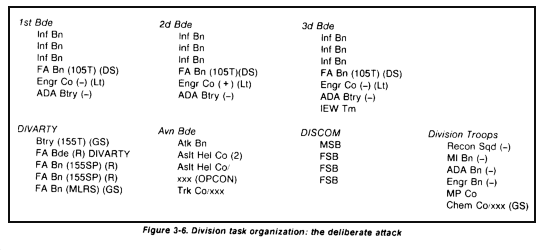 The division has no deep operations. As the lead element in the corps deliberate attack, the division depends on corps and higher headquarters to look deep. Corps provides intelligence and early warning of changes to enemy forces in the division area of interest.