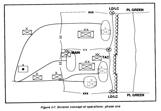 The division commander's concept of operations requires aggressive and deliberate movement over restrictive terrain. The division will conduct an approach march, crossing the LD/LC in brigade column to locate and establish contact with the enemy. Once the division makes contact, it will develop the situation. The division has the option to destroy or contain the enemy, depending on the size of the enemy force and the situation at the time of contact. If the division does not make significant contact, it continues to move until it traverses the restrictive terrain at phase line GREEN (Figure 3-16) and armored forces pass forward.