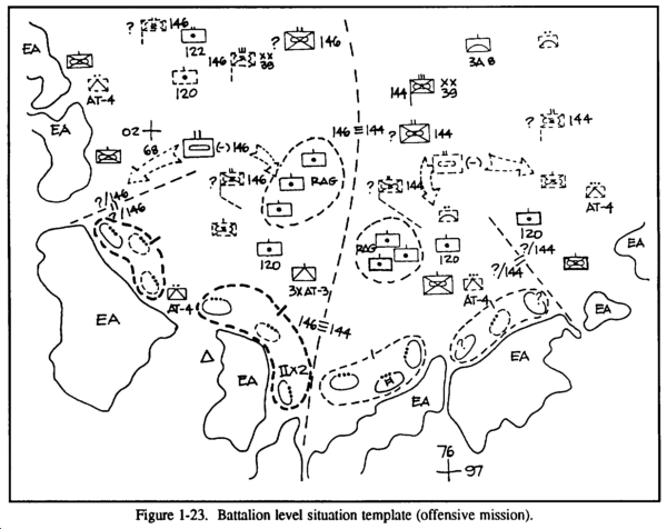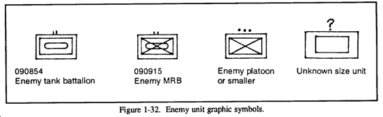 Spot reports depicting time, location, direction of movement, and composition should be marked in red. Use cellophane stickers or red pen. If red is unavailable, use double lines. Another method is to log the spot report, assign the report a number, and place the number by or on the unit symbol. Try to put as much information as possible on the unit marker without losing clarity. Unknown enemy information is not added to the symbol until the information is confirmed. (See Figure 1-32 for examples of enemy unit graphic symbols.)