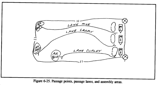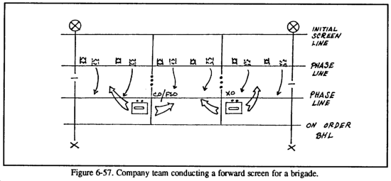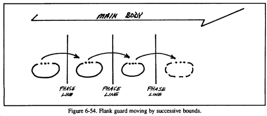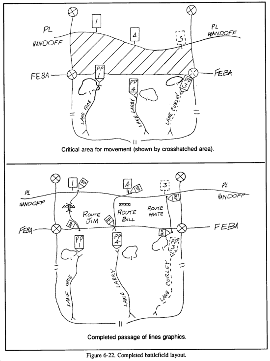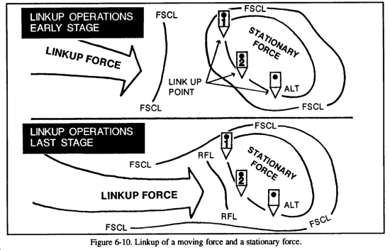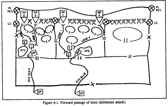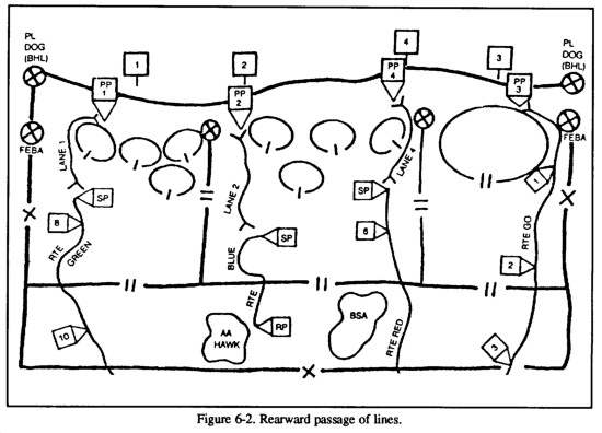 A passage of lines is an operation in which one unit is passed through the positions of another, as when elements of a covering force withdraw through the forward edge of the MBA or when an exploitation force moves through the elements that conducted the initial attack. A passage of lines may be designated as a forward or rearward passage of lines (see Figures 6-1 and 6-2). The primary purpose of a passage of lines is to maintain the movement or maneuver of units. This operation is necessary when the factors of METT-T do not permit one unit the freedom of bypassing another friendly unit and therefore must pass through it. A passage of lines maybe conducted--