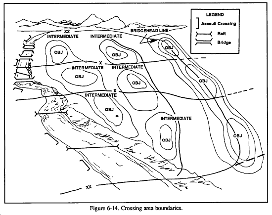 One of the most critical aspects of a passage of lines is terrain management. The passing brigade's S3 will coordinate with the stationary brigade's S3 to receive information concerning the disposition of friendly forces within the stationary brigade's AO. Unoccupied areas may represent possible locations to station future units of the passing brigade. With the IPB complete and a thorough understanding of the restrictions presented by location of the stationary brigade, the S3 will prepare his tentative plan within the parameters established by the brigade commander. Within this planning, the S3 will also examine the location of the contact points to determine whether or not they are compatible with the scheme of maneuver. Once the contact points have been finalized, the S3 will coordinate with the stationary force's S3 to negotiate the location of the passage lanes. It is important to remember that the physical characteristics and number of the passage lanes will determine the speed and disposition of the passing force as it crosses the LD. Therefore, when conducting a forward passage in preparation for a deliberate attack, it may be important to create passage lanes with sufficient width to allow the passing force to move in a tactical formation appropriate to the operation, such as company columns or a platoon wedge.