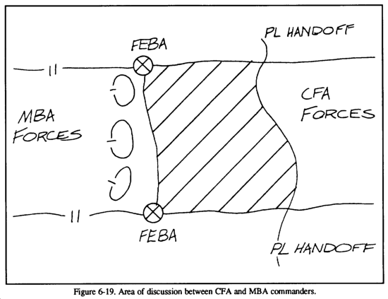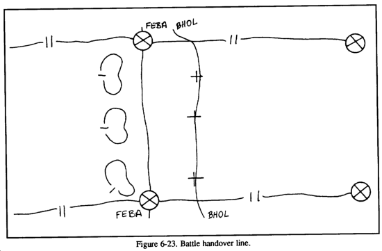 Handover occurs along a line defined as the battle handover line (BHL). This line is a phase line forward of the stationary force recognizable on the ground. The line is established by the common commander in consultation with both commanders. The stationary commander has the major determination in the BHL location. This line is forward of the FEBA in the defense or the FLOT in the offense. It is drawn where elements of the passing unit can be effectively overmatched by direct fires of the forward combat elements of the stationary unit until the battle handover is complete. The area between the BHL and the stationary force belongs to the stationary force commander. He may employ security forces, obstacles, and fires in the area.