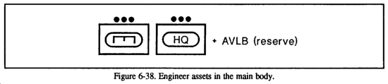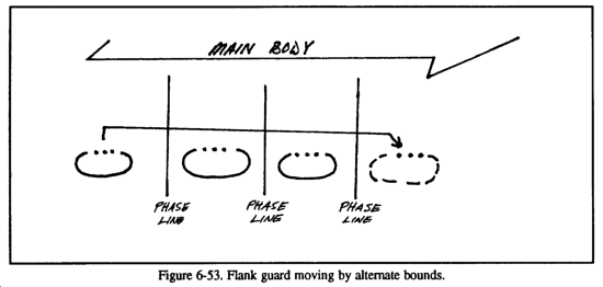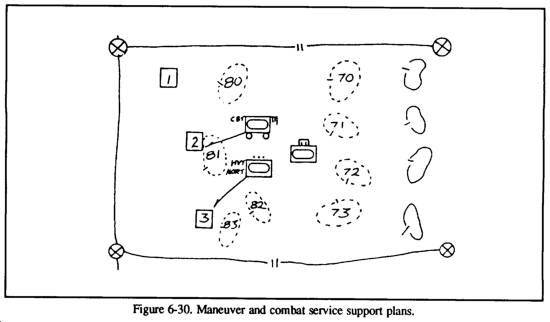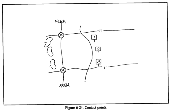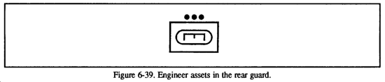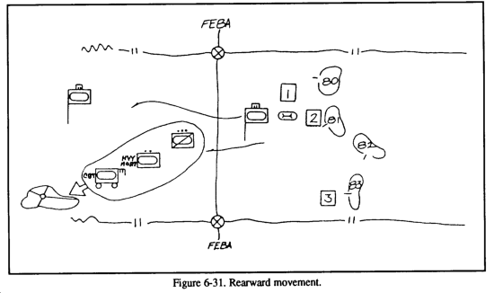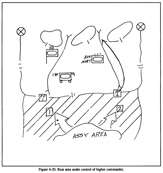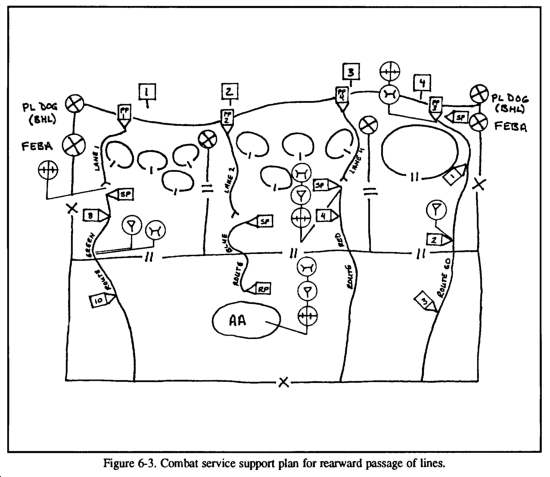 In the rearward passage, the FSB should move in preparation of the passage, establishing the required support agencies and a tentative location for the BSA. (See Figure 6-3.) The support assets of the stationary unit should be used to advantage to free up some of the passing force's support operations in a depth location. A forward passage of lines is similar in that the stationary force should be used to advantage: however, the passing force's support should be kept as mobile as possible to be better prepared to react to the fluid nature of offensive operations.