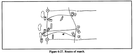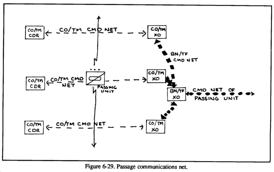 As each element reaches the contact point the information will be relayed to the collocated headquarters. The location of each element must be closely watched to ensure that delays by passing units will not have a negative impact on other forces. The most dangerous circumstance would involve a bottleneck of passing forces and an enemy ground and air attack. To avoid this, the commander must ensure that each moving element maintains its integrity and an appropriate distance from the other elements. Should the passage occur slower than planned, FRAGOs will be issued to the units waiting to pass, simply pushing back their time of execution. Units should remain in their AAs until it is time to move, rather than move to the contact point and wait in line.