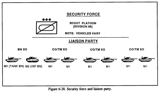 A relieving unit reconnaissance element should include the brigade commander, the S3, S2, an LO, the FSO, battalion commanders the S1/S4 party and at least a tank or mechanized platoon for a security force. The relieved force commander should initially select at least two routes and contact points for the relieving unit. Relieving elements scheduled to move along these routes use them to travel to the linkup point or contact points. The relieving unit's reconnaissance and liaison element with the TOC and trains must move to the relieved unit's location immediately upon receiving the order from higher headquarters.