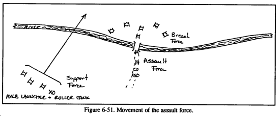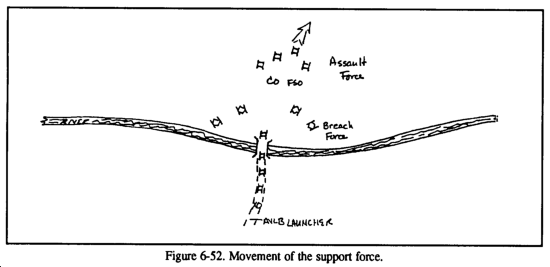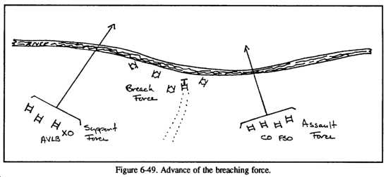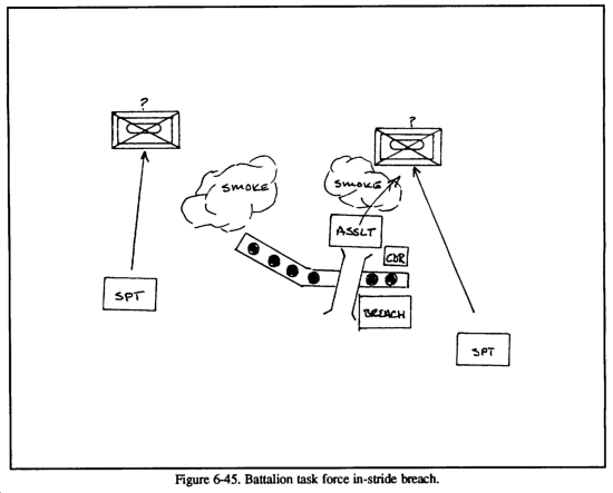 While the in-stride breach is conducted primarily as a drill, there are aspects of the operation that will require the clear, terse, and anticipatory directions of the commander. For example, the commander should place the support team and designate its orientation, ensuring that it can accurately suppress the enemy while at the same time overwatching the activities at the breach site. Usually, he will have the XO (and sometimes the FSO) remain with the support team to ensure that both direct and indirect suppression are effectively controlled. The commander will place himself with the breach team to ensure the location of the lane does not lead the company team into danger on the far side of the obstacle. Once the lane is open, he is then in an opportune position to control the assault of the enemy position. He will follow the assault as he would any hasty attack; at the same time, he will position himself to resume the original offensive mission. He will direct the support team forward to secure the breach and then assess the company's ability to continue.
