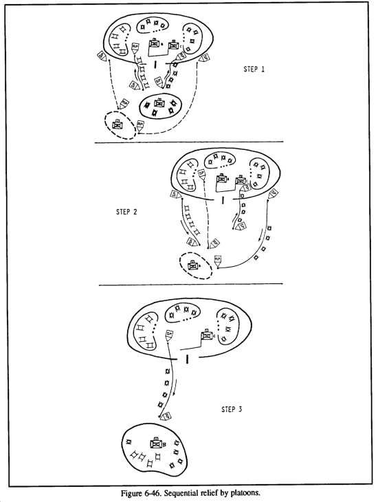 Sequence of relief (if not specified by the headquarters ordering the relief). To establish the strongest defense during the relief, the relief in place is executed by stages, either to the front or from front to rear. In determining the sequence of the relief, both commanders should consider--