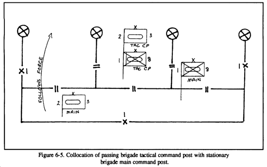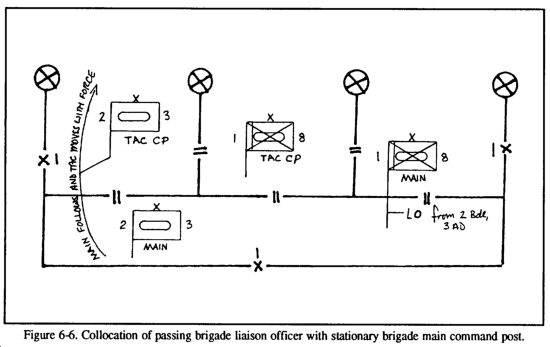 The collocation of headquarters in preparation for the passage of lines may be accomplished in several ways. The situation and terrain will determine for the most part which type of collocation is best. Figures 6-4, 6-5, and 6-6 illustrate three types of collocation. The first is the collocation of the two brigade main CPs. While this perhaps best facilitates information exchange, it also presents a lucrative target for air or missile strikes. The second option is to locate the passing brigade's TAC CP or TOC with the stationary brigade's main CP. This option provides more flexibility to the passing brigade in terms of its own C2. The last option is for the passing brigade to send an LO to the stationary brigade's main CP. This technique is used only when the situation does not permit the first two options generally because the location of the stationary main CP does not support the C2 of the passing force.