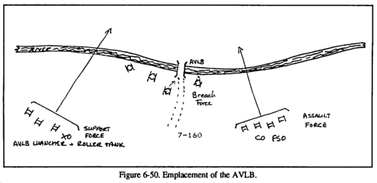 The 1SG will direct the lowboy into position if the commander decides to use the roller. The remainder of the trains will move to a covered and concealed position from which they will be able to support the operation. The 1SG and the medics will identify evacuation routes to both the support team's position and the breaching site. The M88 should also be prepared to assist in keeping the breaching lane clear by removing damaged or destroyed vehicles that may block the lane during the operation.