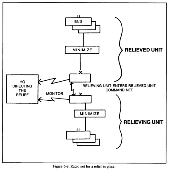 - Communications during the relief are conducted on the command frequency of the outgoing unit at all levels. Radio nets of the incoming unit should not be used in the new area until after the relief is complete.