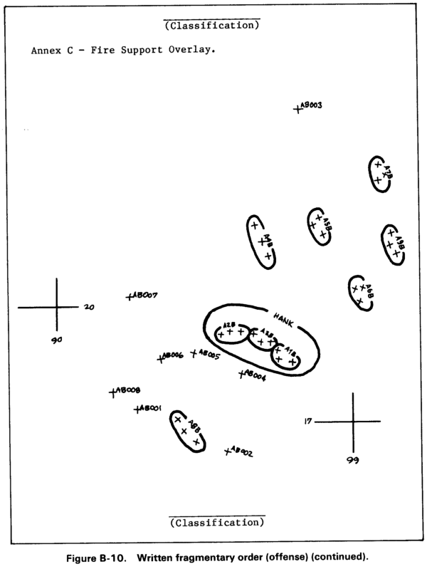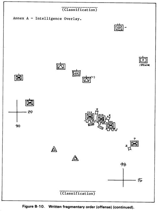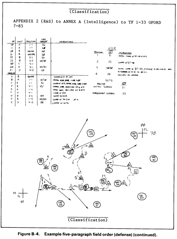 a. Figures B-3 through B-5 show the progression of a defensive order from a warning order to OPORD and a modifying FRAGO. These orders are examples of the detailed orders that would be prepared if time and facilities are available. Figure B-6 shows a FRAGO that is issued over a secure radio net. Figure B-7 is an example of a task force hasty attack.