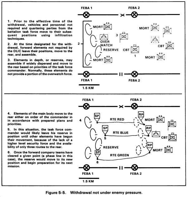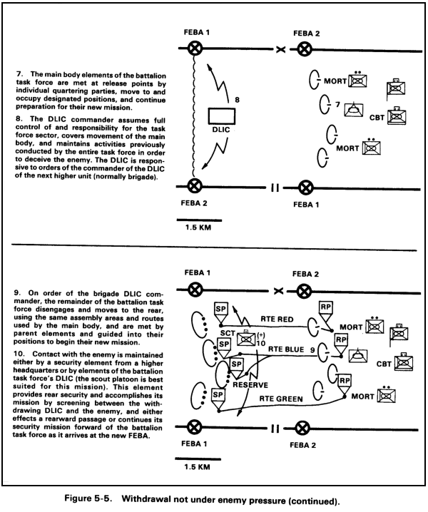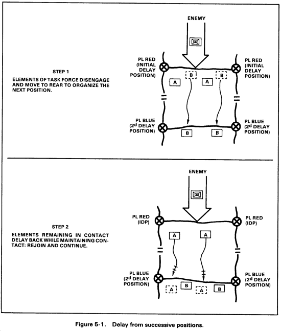 (3) When the order to delay back is received, a portion of the unit concerned displaces directly to the rear and occupies the next designated position. The remainder of the unit maintains contact with the enemy between the first position and the next delay position. As these elements pass through, the enemy is engaged at maximum effective range from the next delay position. When the battalion task force is no longer able to hold the position without becoming decisively engaged, it moves to the next successive position.