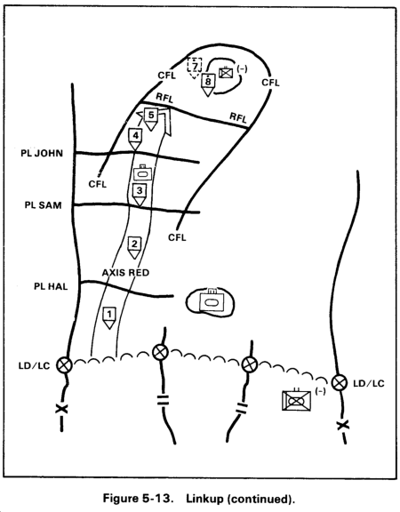 (5) The leading team maintains contact with the rear of the advance guard battalion task force (of the main body) and screens the area between the main body and the flank guard axis of advance.