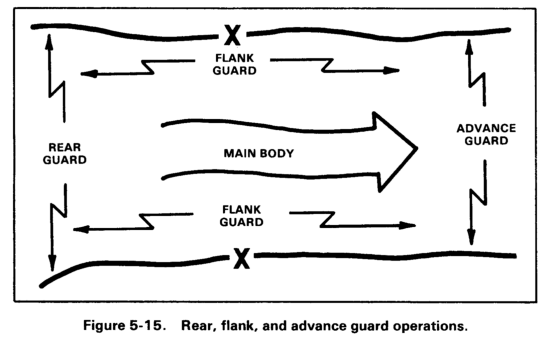 (2) Normally, the main body commander specifies which units to protect. This responsibility usually extends from the rear of the lead battalion task force in the main body to the rear of the main body, exclusive of the rear guard. It is the flank guard's responsibility to monitor movement of the main body and key his movement accordingly.