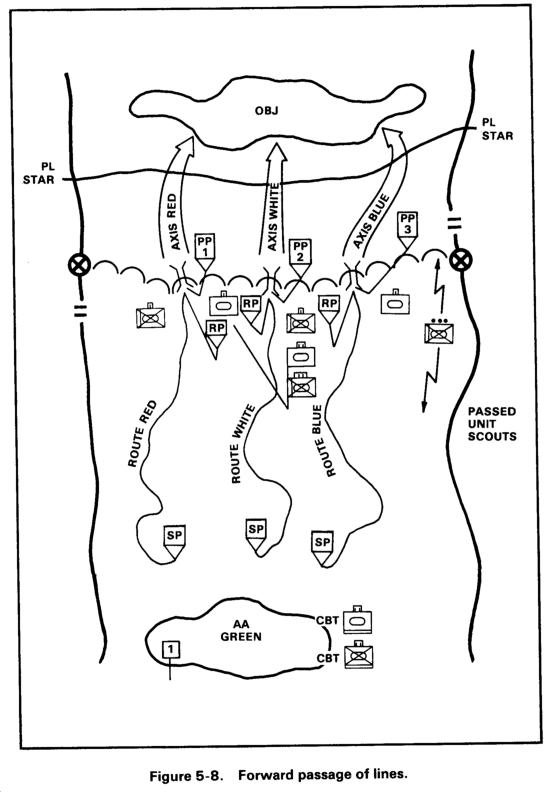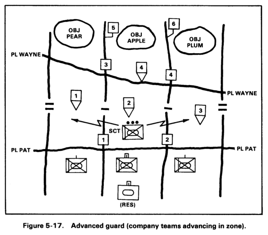 (1) A task force conducting an advance guard normally conducts a movement to contact with company teams advancing on axes (see Figure 5-16), in zone (see Figure 5-17), or, rarely, along directions of attack, depending on the commander's estimate.