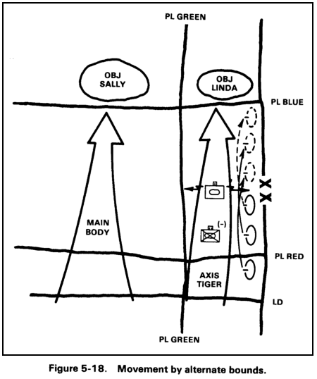 (a) Alternate bounds. This method (see Figure 5-18) may be used when the protected force is advancing slowly and strong enemy action is anticipated against the flank guard. In this method, designated elements of the flank guard occupy new positions as required by the movement of the main body. This method is secure but slow.