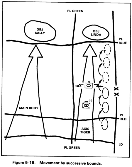 (b) Successive bounds. This method (see Figure 5-19) is used when the movement of the main body is characterized by frequent short halts, and enemy action against the flank guard is light. Each company team occupies designated battle positions. When forward movement resumes, company teams move simultaneously, retaining their relative position in the flank guard formation as they move forward to occupy new battle positions.