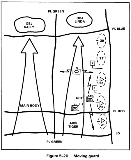 (c) Moving guard. This method is used when the main body is advancing rapidly at a constant rate and there is no enemy action on the flank (see Figure 5-20). The flank guard uses a column formation and moves without halting, adjusting its rate of advance to the movement of the main body. Air and ground elements from the main body or the flank guard reconnoiter to the flank as the remainder of the flank guard moves along the route of advance. Battle positions are still planned and, if necessary, are occupied.