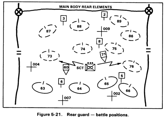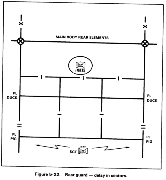 (2) A battalion task force commander conducting a rear guard operation follows the same axis of advance as the protected force at a distance prescribed by the main body commander. (The prescribed distance is normally within artillery range.) The task force commander establishes company team battle positions (see Figure 5-21) or sectors (see Figure 5-22). With sectors, he designates phase lines and checkpoints to control movement.