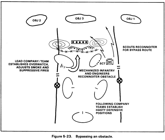 Obstacles are always bypassed when possible. When enemy "firesacks" can be avoided, bypassing an obstacle prevents friendly troops and vehicles from being exposed to enemy direct and indirect fire (see Figure 5-23). Scouts are deployed laterally around an obstacle to reconnoiter the limits of the obstacle, bypass routes, available cover and concealment, enemy locations and weapons, and enemy counterattack routes into the area on the far side of the obstacle and over bypass routes. Overwatch elements must immediately be established to provide protection for the scouts. This must be planned and rehearsed to save time and prevent confusion. Normally, the lead company establishes the overwatch. At the same time, scouts are reconnoitering laterally for bypass routes; and infantry and engineers are reconnoitering the obstacle, since bypass may not be possible. Aviation assets provide assistance in locating bypass routes, overmatching ground elements, and preventing enemy reinforcement or counterattack.