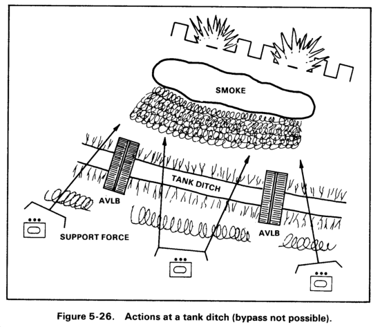 f. Hasty Breach of a Tank Ditch. A properly emplaced tank ditch is a formidable obstacle. Because of the equipment and effort required to construct the ditch and because of its importance to the defender, it is probably mined with antitank and antipersonnel mines, and reinforced with wire. In addition, tank ditches are always covered by direct and indirect fires (see Figure 5-26). When the battalion encounters a tank ditch, it must quickly and aggressively perform the following: