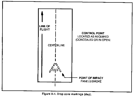 Drop zones will not normally be marked for combat drops unless the CCT or pathfinder teams have been inserted before H-Hour. Daylight markings must be established and understood by all participants. (Figure A-1.)