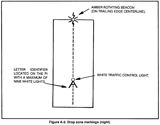 Assembly of personnel and equipment at night on an unfamiliar and hostile DZ may be the most difficult task an airborne force must do. The marking of the DZ can be done using the same techniques discussed for daylight DZ marking. However, the uncertainty and confusion that is inherent with a night drop must be considered. (Figure A-2).