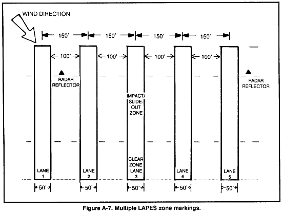 Lane dimensions for multiple LAPES operations are the same as for single operations. When establishing two or more lanes, only the right side of the lane is marked. If available, radar reflectors are placed at the trailing edge of the first and last lanes. (Figure A-7.) When possible, additional lanes are staggered 100 feet down from lane one. However, additional lanes can be established side by side beginning at the same parallel starting point. There are always 150 feet between lane centerlines. Extraction lanes are designated in numerical sequence from left to right. The left lane in direction of flight is designated as lane one. The lead aircraft extracts on the downwind lane. Normally, aircraft spacing is either 10 seconds or 1 minute.