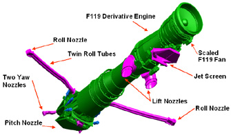 ![]() | ![]() The Lockheed Martin X-35 concept for the Marine and Royal Navy variant of the aircraft uses a shaft-driven lift-fan system to achieve Short-Takeoff/Vertical Landing (STOVL) capability. The aircraft will be configured with a Rolls-Royce/Allison shaft-driven lift-fan, roll ducts and a three-bearing swivel main engine nozzle, all coupled to a modified Pratt & Whitney F119 engine that powers all three variants. |