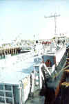 This is a stern view of a Landing Craft Utility. The craft is 135 feet in length
