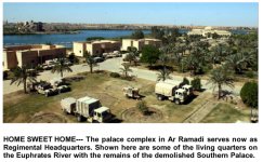 The Ar Ramadi palace complex has undergone an extreme transformation since the 3d Armored Cavalry Regiment arrived. The opulent palace complex that once was home to balls and affluent guests of Saddam Hussein is now the Regimental Headquarters, otherwise known as Rifles Base.