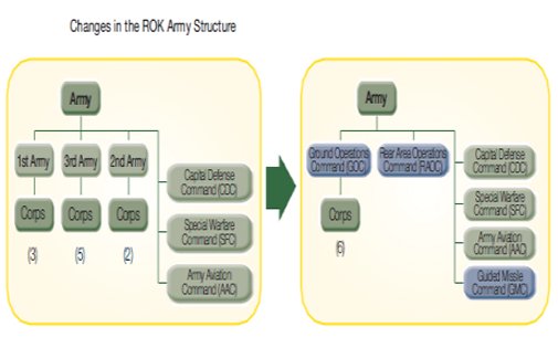 The ROK Army was to restructure it by reducing the numbers of army corps and divisions, as reinforcing the combat capability of each unit in twice to three times. The Army was to also secure weapons and equipment with high combat efficiency and increase the unmanned aviation vehicles, next generation tanks, armored personnel carriers, firepower system, simplifying the command structure so that it can transform into a modernized organization.