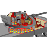 Contrary to common belief, the carousel is well protected from above. During loading, the round passes through the door that closes after the tray has retracted, and therefore in the case of turret penetration the incandescent splinters will land on the autoloader roof and not ignite the carousel. Nevertheless, the extra rounds stored in the fighting compartment are very likely to ignite in this case, and of course the lower hull penetration is quite deadly.