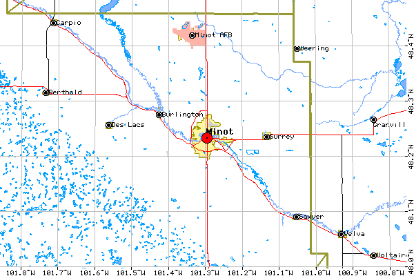 Ten miles of divided highway separate Minot, the base, from Minot, the town, population 37,000. The community is a winter wheat center claiming to be the smallest town in the country with a paid symphony orchestra. It also has a performing theater, opera company, art gallery and four-year Minot State University. Randy Burckhard, chairman of the Chamber of Commerce, said the base contributes some $227 million to the town's economy - second only to agriculture.